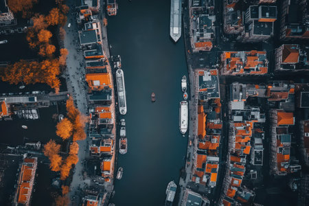 An aerial view reveals a narrow canal lined with colorful rooftops and boats gliding through, as trees display vibrant autumn hues, creating a lively atmosphere.