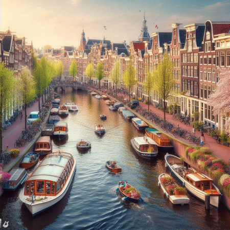 Tulip petals drift gracefully on Amsterdams canals, surrounded by bicycles and bridges, evoking a beautiful spring ambiance under the vibrant sky.