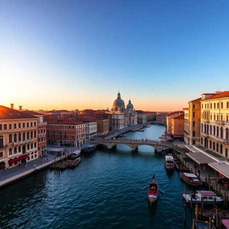 Aerial view of the Grand Canal and Basilica di Santa Maria della Salute during sunset.