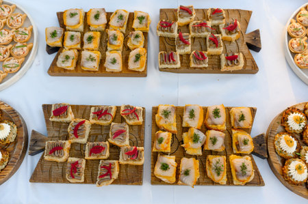 A variety of cold appetizers and canapes on wooden boards for a buffet. Table setting with tartlets and canapes on wooden trays in a catering style