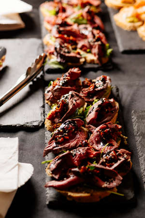 Bruschetta with baked beef, arugula and balsamic sauce on black table with white napkins and kitchen tongs