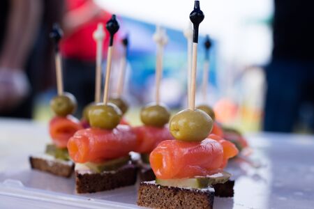 Fish, vegetable canapes on festival wedding table outdoor. Catering service.