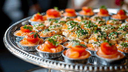 catering display, elegant silver trays holding mouthwatering appetizers and finger foods, ideal for cocktail parties or corporate gatherings