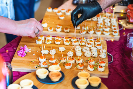 Hands placing gourmet appetizers with toothpicks on wooden trays at catering event. Concept of fine dining, finger food, festive culinary, catering, party food