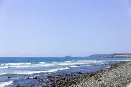 Blue sky above ocean horizon on sunny summer day at rocky coast