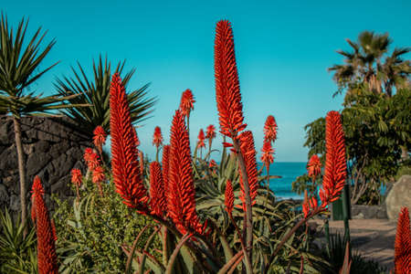 Summer photo of flowers against the background of palms and sky. Beautiful nature of the tropics