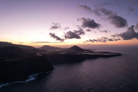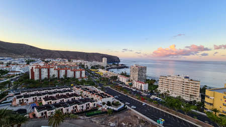 Romantic aerial sunset over the sea in summer seen from a tourist resort in Los Cristianos, Tenerife, Canary Islands, Spain, Europe. Vibrant colours of the clouds. Vacation vibes on the Atlantic Ocean
