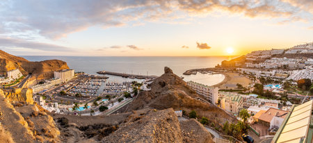 Amazing landscape with sunset at Puerto Rico harbor and village at Gran Canaria, Spain