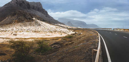 Winding road leads along breathtaking coastline past black volcano and white sand dunes. North of Calhau, Sao Vicente Island Cape Verde