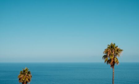 ocean horizon, palm trees and blue sky copy space - summer vacation background