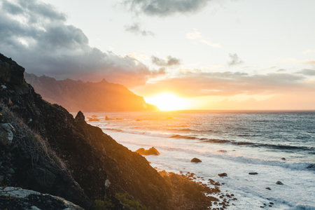 Beautiful scenic view of cliff along North Tenerife coast at sunset. Atlantic wavy ocean with amazing orange sun above the water in Canary Islands.