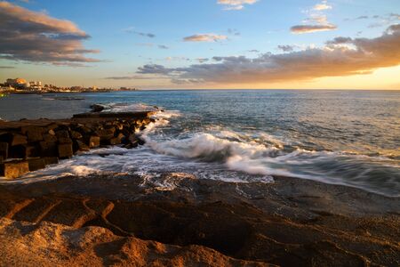 Rocks at topical beach at beautiful sunset.Costa Adeje, Tenerife, Spain