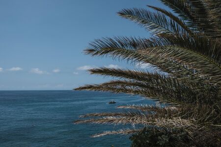 boat on the blue sea horizon behind a palm tree with blue sky and few clouds