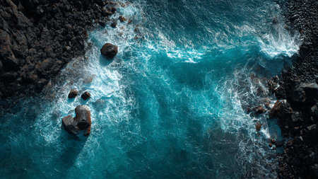 Aerial view of blue ocean waves crashing on rocks. 3D Rendering