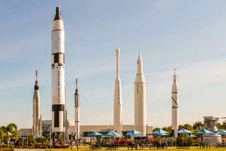 KENNEDY SPACE CENTER, FLORIDA, USA - APRIL 27, 2016: Several rockets are exhibited in rocket garden in the visitor complex of Kennedy Space Center near Cape Canaveral in Florida