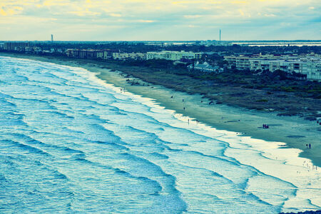 Coastal sunrise over a beach with hotels in the background, captured from an aerial perspective. The image showcases a vibrant sunrise, casting warm golden and orange hues across the ocean and sky. The gentle waves gently caress the sandy beach, and buildings are aligned along the shoreline. This serene coastal scene offers a picturesque view of sunrise, perfect for use in tourism advertisements, travel brochures, or general travel content.