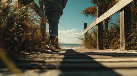 A person walks along a wooden boardwalk surrounded by tall beach grass and palm trees, heading toward the ocean under a clear blue sky, capturing the essence of a relaxed coastal getaway.