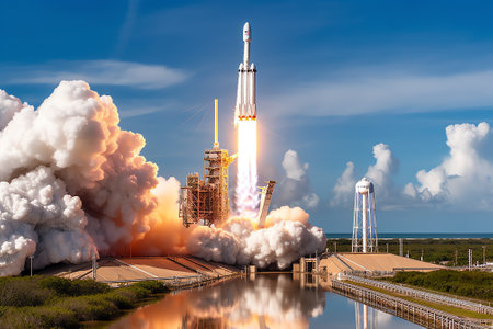 Igniting with immense power, a heavy-lift rocket begins its historic journey to the stars. Plumes of fire and smoke billow from the launchpad, symbolizing a new era of space exploration and human ambition.
