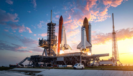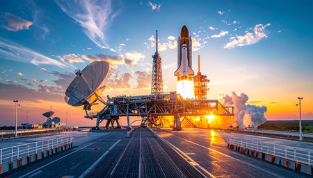 Rocket Launches Into the Sky at Sunrise, Showcasing Propulsion Technology for Space Exploration and Reentry Strategies Generative AI