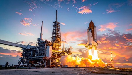 A space shuttle is depicted ascending into the sky, propelled by flames and smoke. The composition features the launch vehicle amidst a backdrop of clouds, with a support structure visible. The image uses a realistic style with detailed textures and lighting, possibly suitable for scientific, educational, or commercial applications.