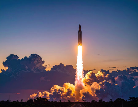 A powerful rocket ascends through the twilight, illuminating the dark sky as it breaks free from the launchpad, leaving a trail of smoke and fire.