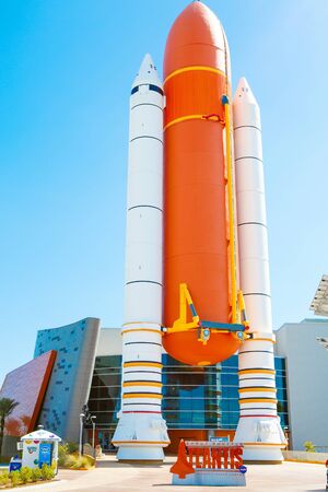 KENNEDY SPACE CENTER, FLORIDA, USA - APRIL 21, 2016: Several rockets are exhibited in the visitor complex of Kennedy Space Center near Cape Canaveral in Florida. Atlantis space shuttle pavilion.