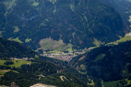 Beautiful panoramic view on the Fassa Valley (Val di Fassa) in Dolomites, Italy. View on Piz Ciavazes, Sassolungo, Sassopiatto, Catinaccio mountains
