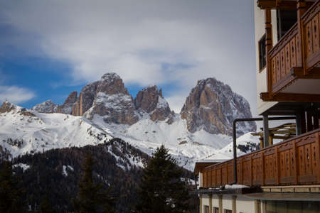 View of the Sassolungo (Langkofel) Group of the Italian Dolomites in Winter from the Belvedere Ski Area in Canazei.