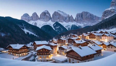 A picturesque village is blanketed in snow under a twilight sky, with imposing rocky mountain peaks looming above.