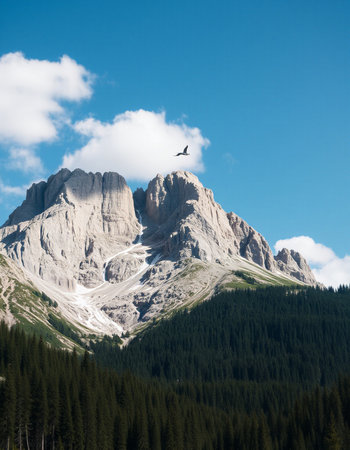 panorama of the Dolomites with snow-capped peaks and green conifers