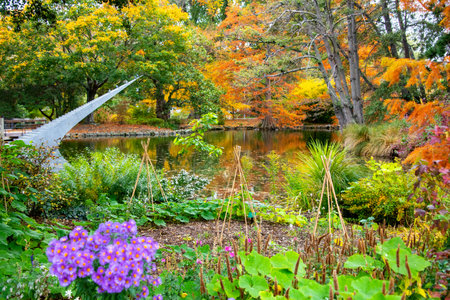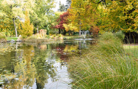 Pond and fountain surrounded by luxuriant autumn foliage in Queenstown Gardens, New Zealand.