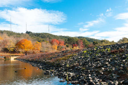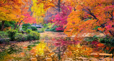 Beautiful autumn landscape with colorful trees and pond in the park.
