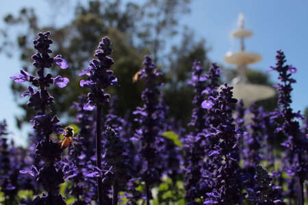 Purple salvia flowers blooming in the garden with a bee