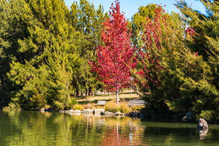Autumn park with pond and red maple tree