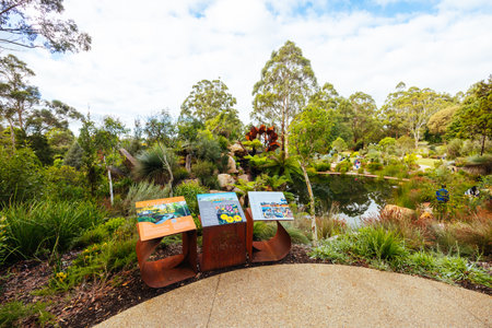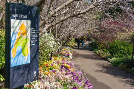 Sydney, Australia - September 23, 2017: Spring alley in Sydney Royal Botanic Garden with navigation map on the foreground