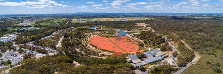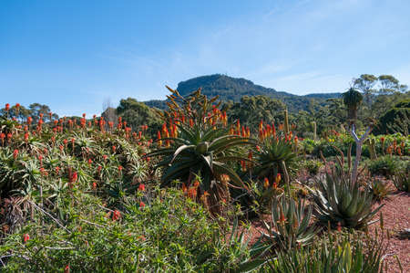 Wide aerial panorama of Australian Desert display at Royal Botanic Gardens in Cranbourne, VIctoria, Australia