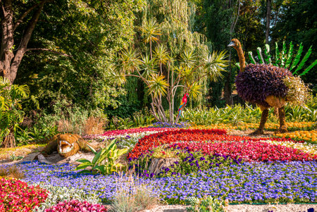 Animals figure made of leaves and bush at annual flower exhibition in garden
