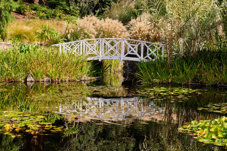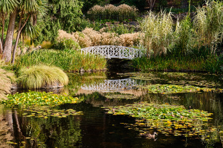 The white bridge across the Lily Pond in the Royal Tasmanian Botanical Gardens - Hobart, Tasmania, Australia
