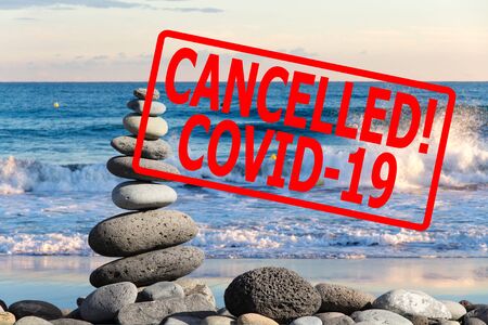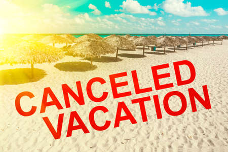Coronavirus causes worldwide cancellation of flights and vacations. World tourist crisis caused by Coronavirus outbreak. Vacation canceled inscription on the background of a beautiful sea landscape.