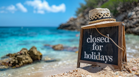 Wooden signboard on a tropical beach with a straw hat and text Closed for Holidays
