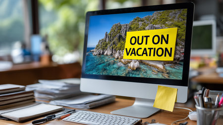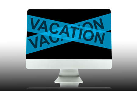 Tropical beach on computer screen with word out of vacation.