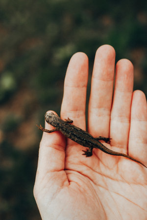 Close-up of an european common lizard in hand. Darevskia praticola.