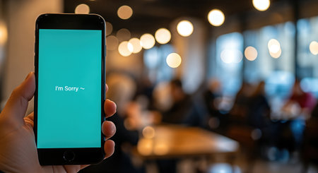 Hand holding smartphone with I'm Sorry message in a warm cafe atmosphere, featuring blurred patrons in the background, illustrating themes of reconciliation and emotional connection