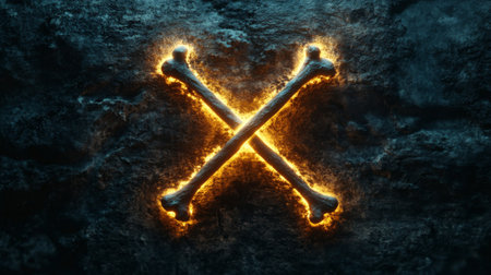 Glowing crossbones embedded in a dark stone wall creating a spooky atmosphere
