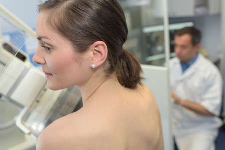 doctor assisting patient undergoing mammogram