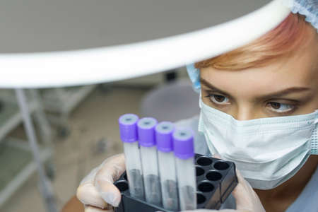 Medical sample in lab tube in the scientist hands in blue medical gloves on light background.