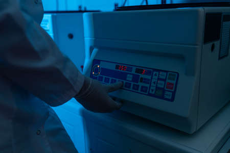 Closeup scientist hand using microscope in laboratory. Unrecognizable researcher working with coronavirus samples. Female doctor in glove doing experiment with covid-19 vaccine. Health care concept
