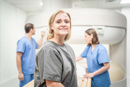 Portrait of a comfortable senior woman smile at camera after MRI in medical clinic. Team of nurses help old lady in hospital after treatment. Caucasian people and health care.