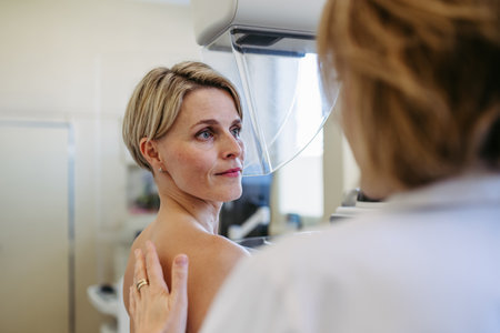 Medical professional calming patient ahead of mammogram procedure.