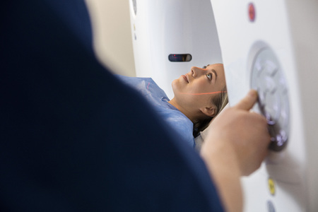 Closeup of female patient undergoing CT scan while doctor operating it in hospital